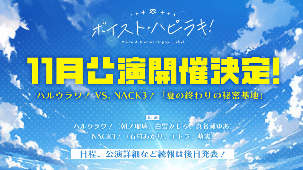 また、「NACK3!」は11月公演「ボイスト・ハピラキ!Voice&Stories Happy Lucky! ハルウラワ! vs. NACK3!「夏の終わりの秘密基地」」の出演も決定!