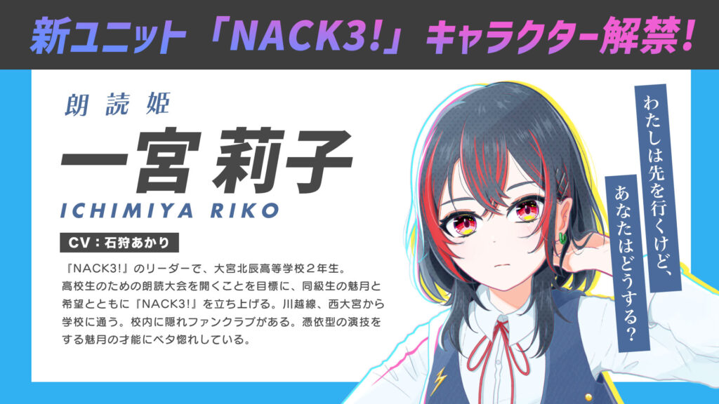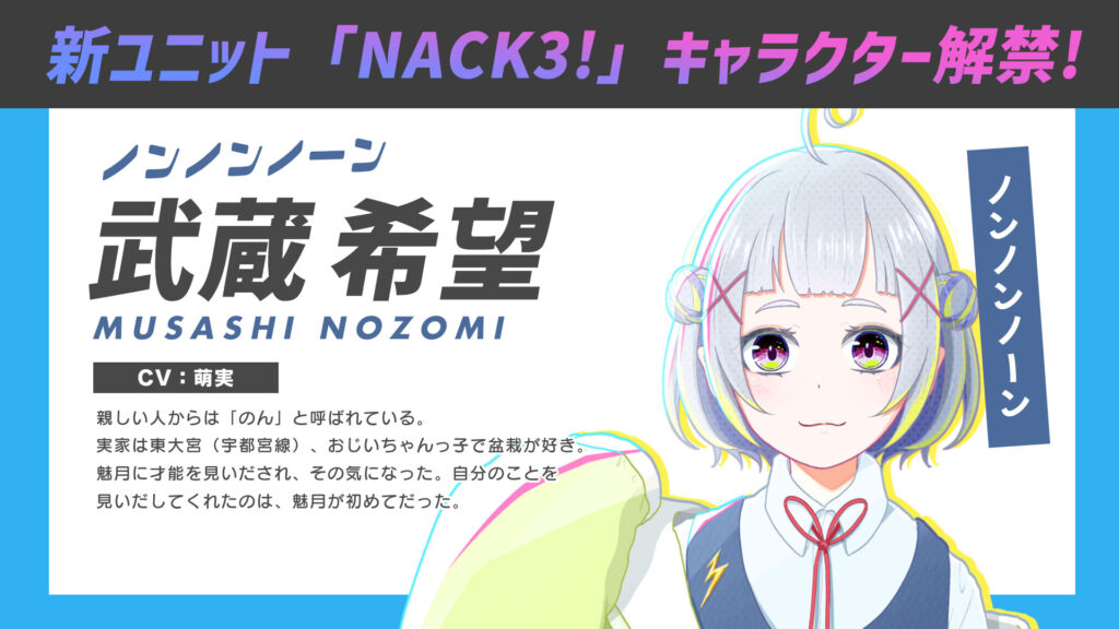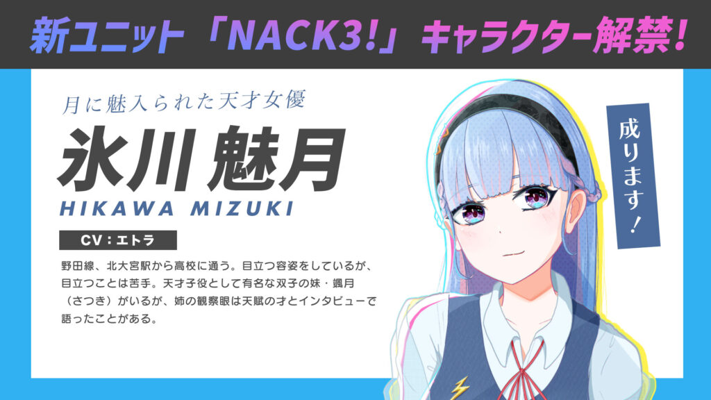 引き続き、「ハルウラワ!」から春ヶ瀬咲楽(cv.朝ノ瑠璃)、調彩乃(cv.白雪みしろ)、別所るん(cv.真名瀬ゆあ)の出演が決定!また、新ユニット「NACK3!」から一宮莉子(cv.石狩あかり)、氷川魅月(cv.エトラ)、武蔵希望(cv.萌実)の出演も決定!新キャラクターの活躍にもご期待ください!