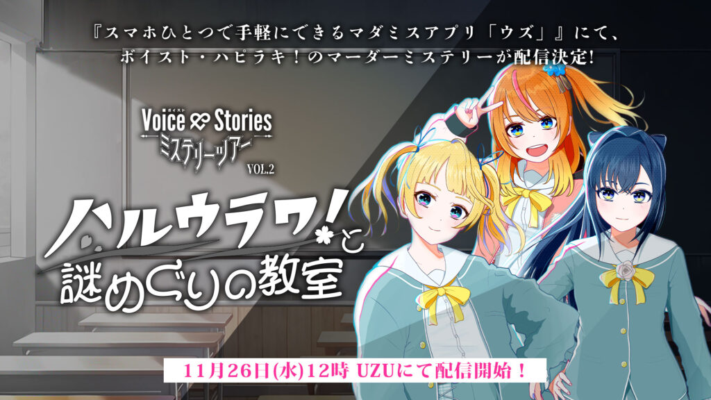 『スマホひとつで手軽にできるマダミスアプリ「UZU(ウズ)」』にて、ボイスト・ハピラキ!のマーダーミステリーが11月26日(水)12時より配信されることが決定しました!